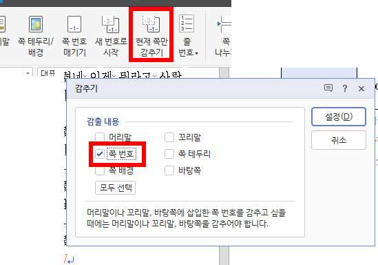 추가로 쪽번호가 안보일때는 쪽 탭에들어가서 현재쪽만 감추기를 눌러보시면 쪽번호가 체크되어 있는 경우가 있습니다.